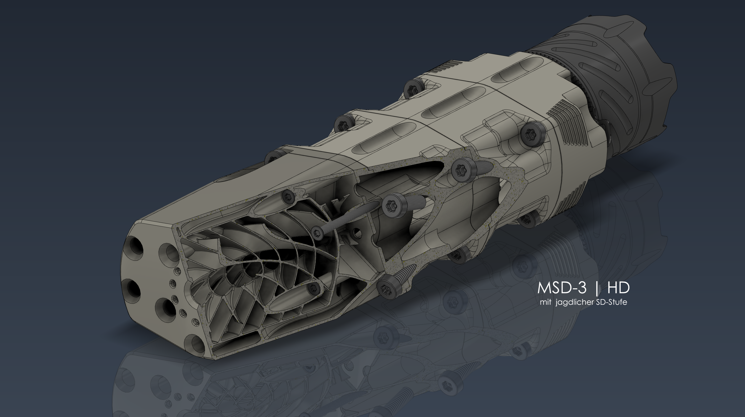 Der MSD-3 | HD ist spiegelsymmetrisch aufgebaut. Der letztlich um das Geschoß verbleibende Gasstrom wirkt an allen gegenüberliegenden Punkten mit den gleichen Parametern auf das Projektil ein.